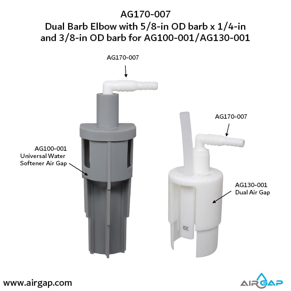 The AG170-007 is a right-angle barb elbow connecting a 5/8-inch ID slip joint on one end to a 1/4-inch or 3/8-inch ID hose/tubing on the other. Dual barb different hose sizes are used in water softeners or RO filters. If a 1/4-inch barb is not used, cut it off to access a 3/8-inch barb.